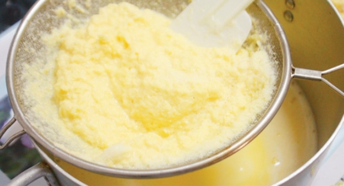 Dùng máy xay sinh tố để xay ngô đã luộc, khi xay bạn cho nước luộc ngô vào để sữa được ngọt hơn. Đổ ngô ra một cái rây để lọc bỏ hết bã ngô.